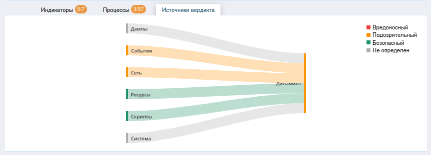 Во вкладке «Источники вердикта» строится графическая карта с источниками и их вердиктами, а также общим вердиктом по исследуемому файлу.