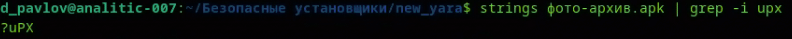 Вывод показал наличие строки ?uPX, что свидетельствует о присутствии сигнатуры UPX или похожего упаковщика, а также стандартные разделы ZIP-архива (AndroidManifest.xml, resources.arsc, res/*).