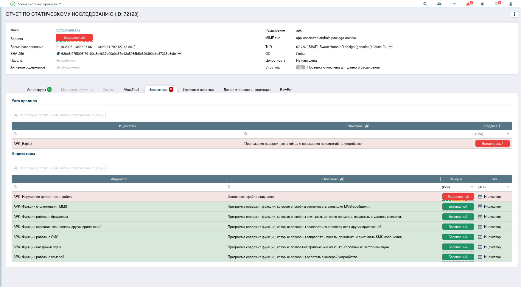 - System Information Discovery (Mobile) - Сработавшие индикаторы: Сбор информации об ОС Android. ПО производит сбор сведений об ОС и аппаратной конфигурации (Build, getprop, версии, патчи, архитектура)