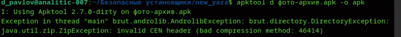 Попытка декомпиляции через apktool завершилась ошибкой. Это типичный признак повреждения ZIP-структуры вследствие модификации упаковщиком: некоторые сегменты APK могут быть перепакованы нестандартным алгоритмом или зашифрованы.