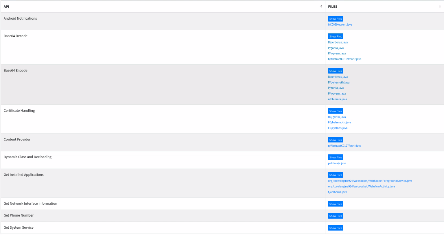 На этапе декомпиляции MobSF выявил обширное использование API для обработки Base64-строк, динамической загрузки классов, работы с сетью и доступом к SMS-функционалу. Это позволило локализовать ключевые участки логики, отвечающие за обфускацию и обмен данными с сервером управления.