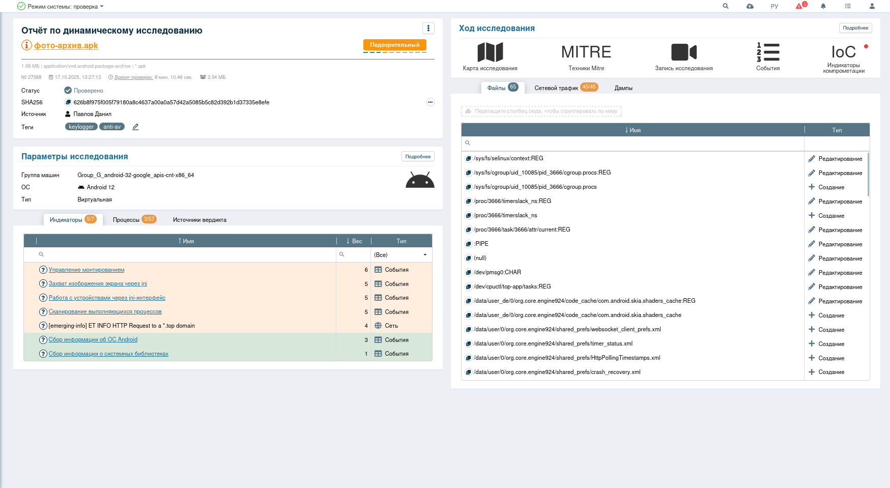 Динамический анализ проводился в изолированной среде, созданной в системе ATHENA, на основе виртуальной машины, с OC Android 12.
