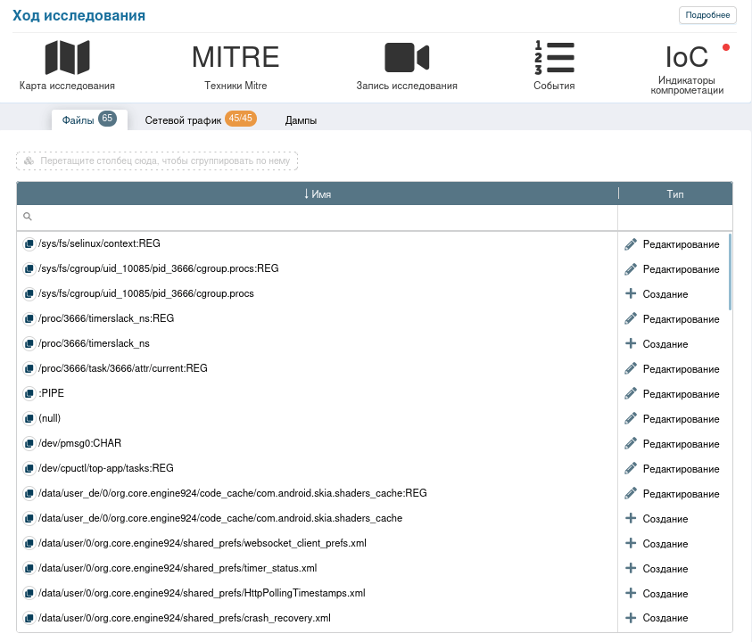 В блоке «Ход исследования», можно наблюдать, изменения в файловой системы, наличие сетевого трафика, а также создание дампов с различными расширениями.