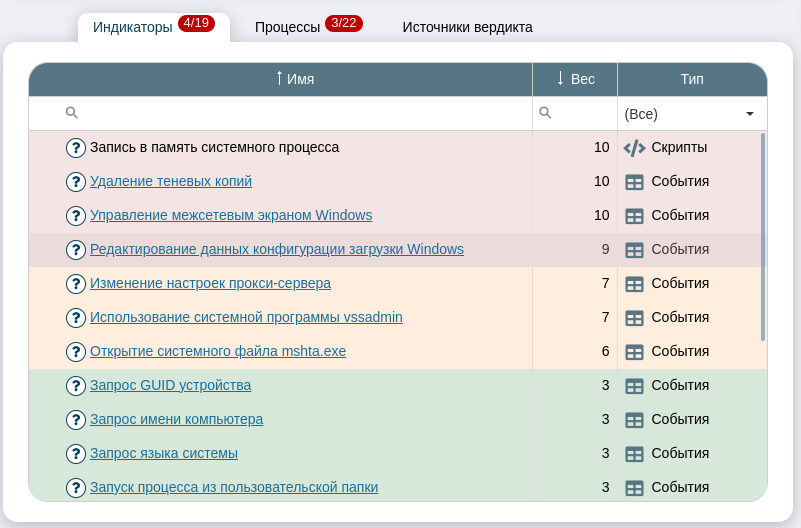 Вкладка «Источники вердикта» показывают все источники (статические и динамические), которые сработали и вынесли вердикт.