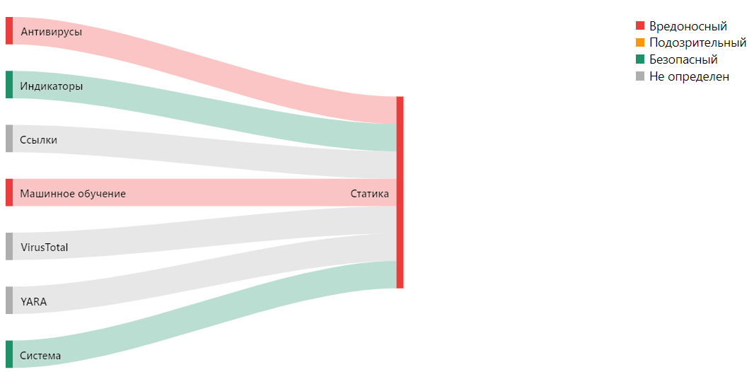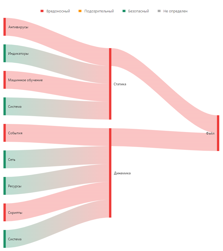 Во вкладке «Источники вердикта» строится графическая карта с источниками и их вердиктами, а также общим вердиктом по исследуемому файлу