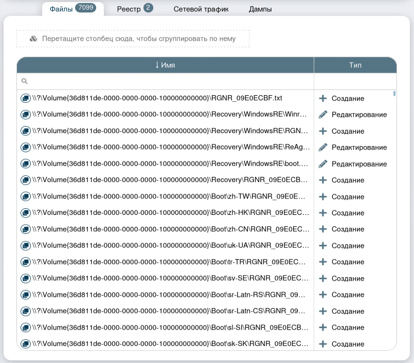 Вкладка «Файлы» показывает созданные/редактированные шифровальщиком файлы