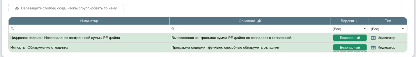 Во вкладке «Индикаторы» сработали информативные индикаторы «Цифровая подпись: Несовпадение контрольной суммы PE файла» и индикатор «Импорты: Обнаружение отладчика»