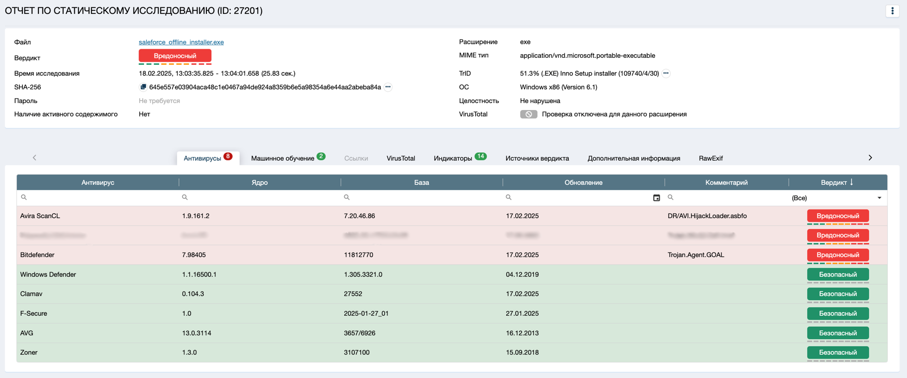 При проверке антивирусами было обнаружено, что в файле обнару-жен вредоносный загрузчик (HijackLoader).