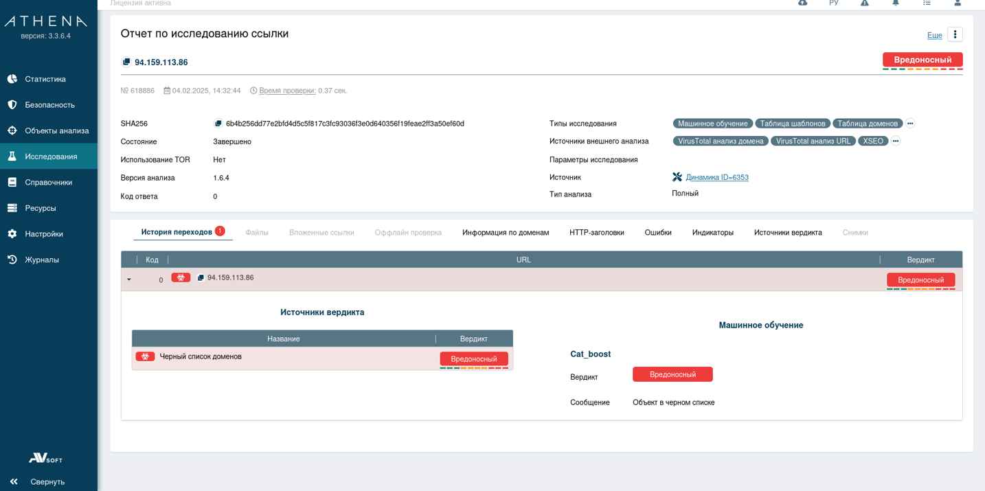 Во вкладке «Сетевой трафик» видим, что была обнаружена вредоносная ссылка. При переходе в отчет можем увидеть, что данный IP-адрес находится в черном списке доменов.