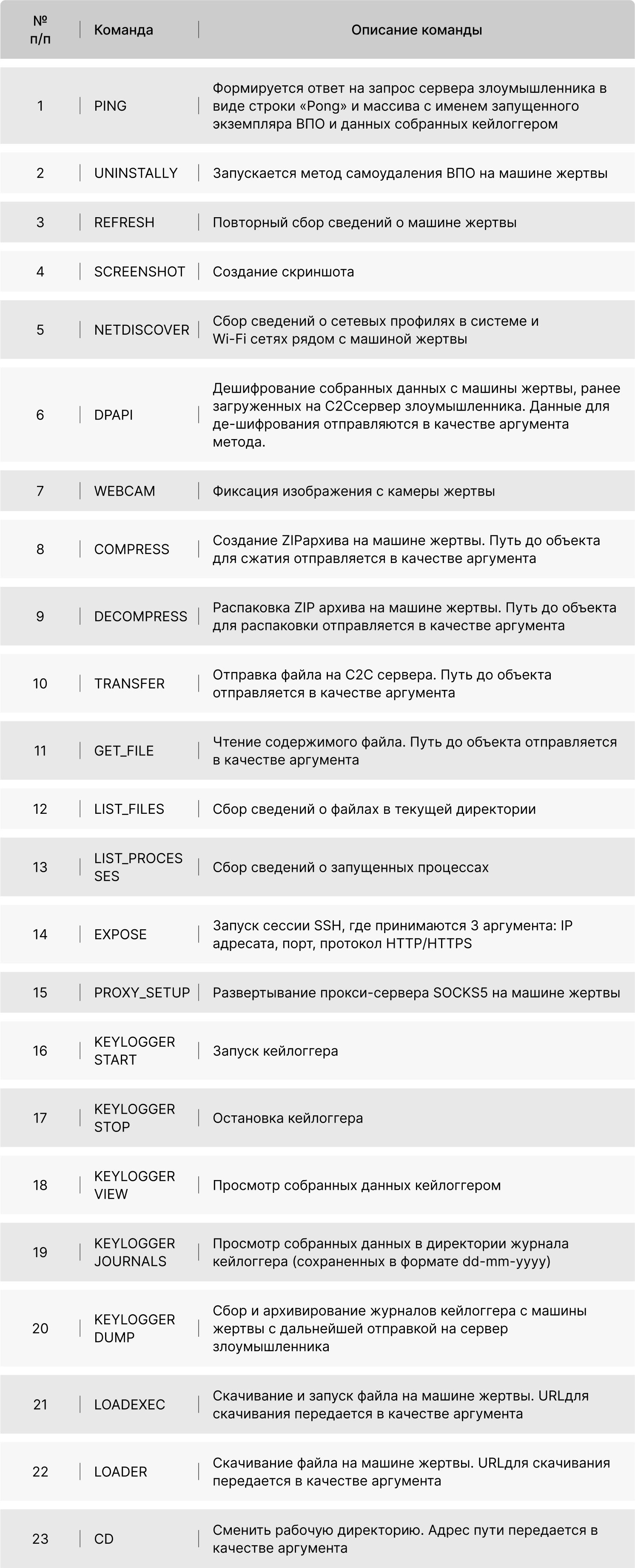 Список всех доступных команд для взаимодействия с машиной жертвы представлен в таблице ниже: