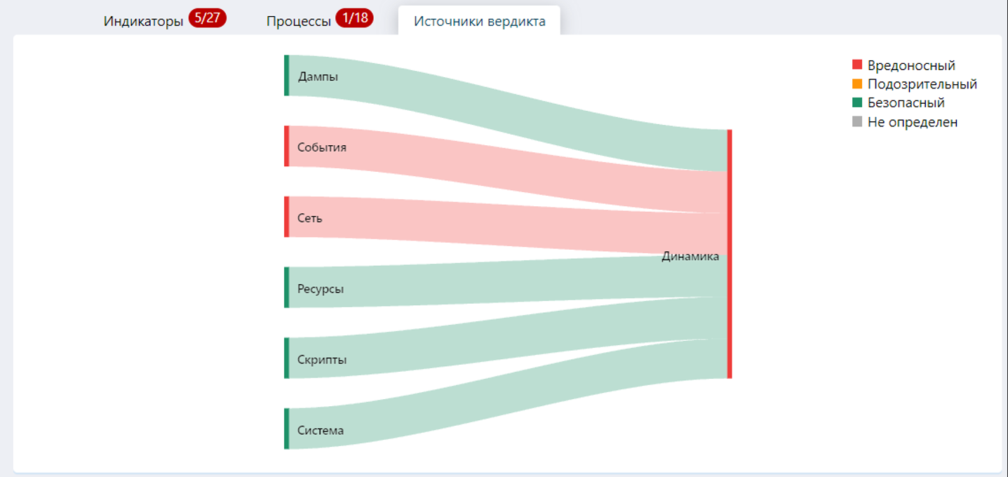 Во вкладке «Источники вердикта» можем ознакомиться, каким образом был сформирован вердикт для проверяемого файла.