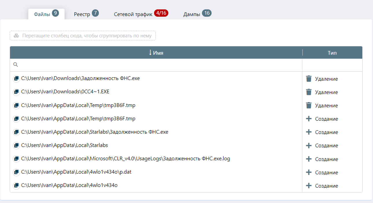 Все собранные дампы (процесса и созданных файлов) отображаются в блоке «Дампы». Каждый дамп проверяется в статическом исследовании.