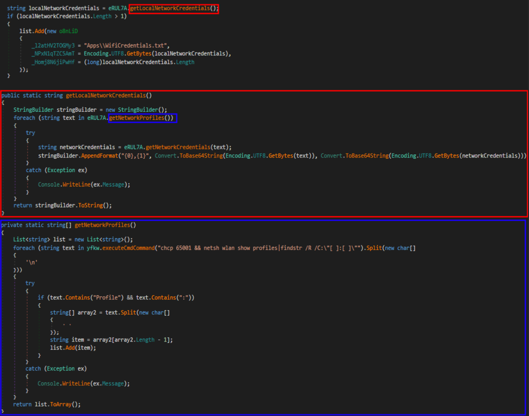 При обнаружении профилей, выполняются инструкции извлечения сохраненных имен профилей и паролей от них. Полученные сведений сохраняются в файл «Apps\WifiCredentials.txt».