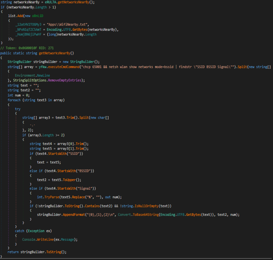 В том числе, ВПО собирает не только сетевые профили машины жертвы, а также доступные Wi-Fi сети поблизости, извлекаются данные о их именах (SSID), уникальных идентификаторах (BSSID) и уровне сигнала.