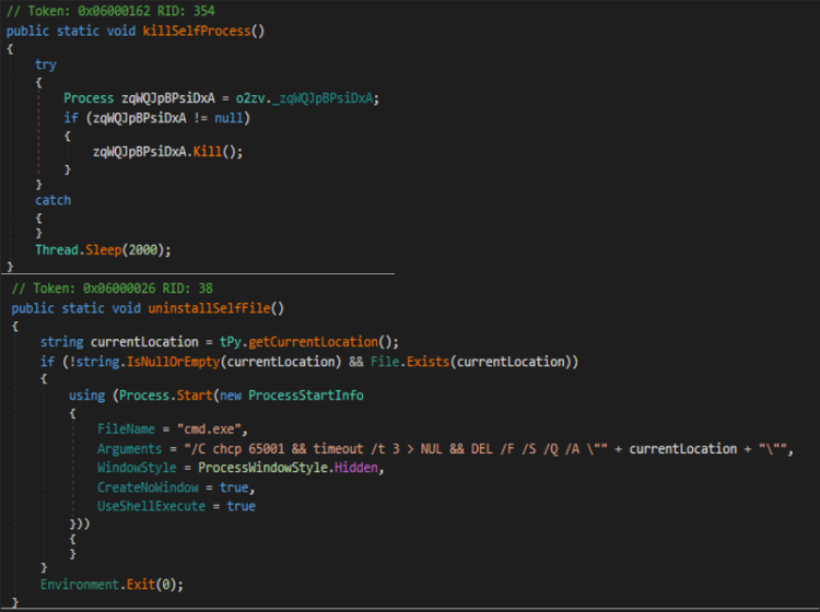 При получении команды «UNINSTALLY» с управляющего сервера запускается метод самоудаления ВПО: удаляется текущий (запущенный) экземпляр вредоноса и завершается исполняемый процесс.