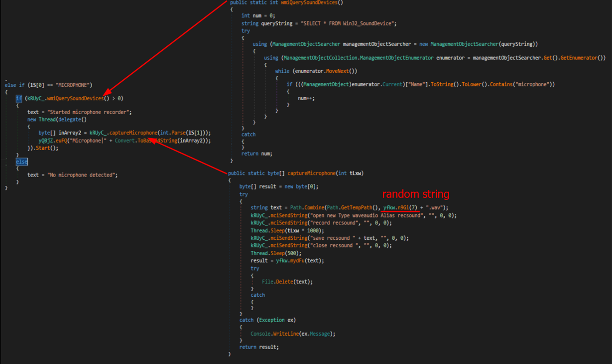 Практически аналогично запускается функция для снятия звука с микрофона жертвы, однако она не выполняется по команде с удаленного терминала. Полученные данные, записываются на машине жертвы в случайно сгенерированную строку с расширением файла «.wav», с дальнейшей отправкой злоумышленнику.