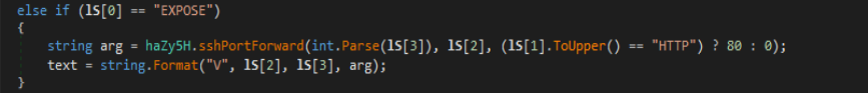 При получении команды «EXPOSE» запускается прокси-сервер на машине жертвы. На выбор возможна реализации посредством протокола SSH и протокола Serveo либо TOR, в зависимости от того, что было указано в конфигурации.