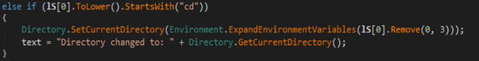 При получении команды «CD» меняется текущая директория в консоли у злоумышленника: