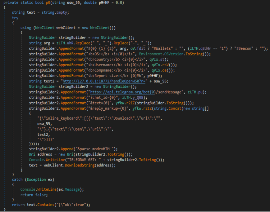 После того, как данные были отправлены на подконтрольные сервер, формируется второй «отчет» через Телеграм-бота, который отправляется в чат злоумышленнику: