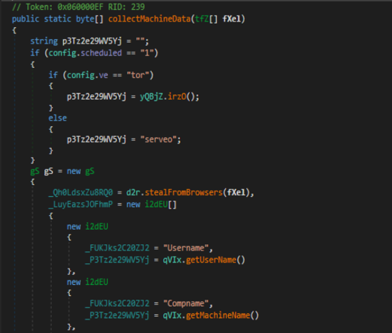 При получении команды «PING» с управляющего сервера формируется строка с ответом «PONG» и массива с именем запущенного экземпляра ВПО и данных собранных кейлоггером
